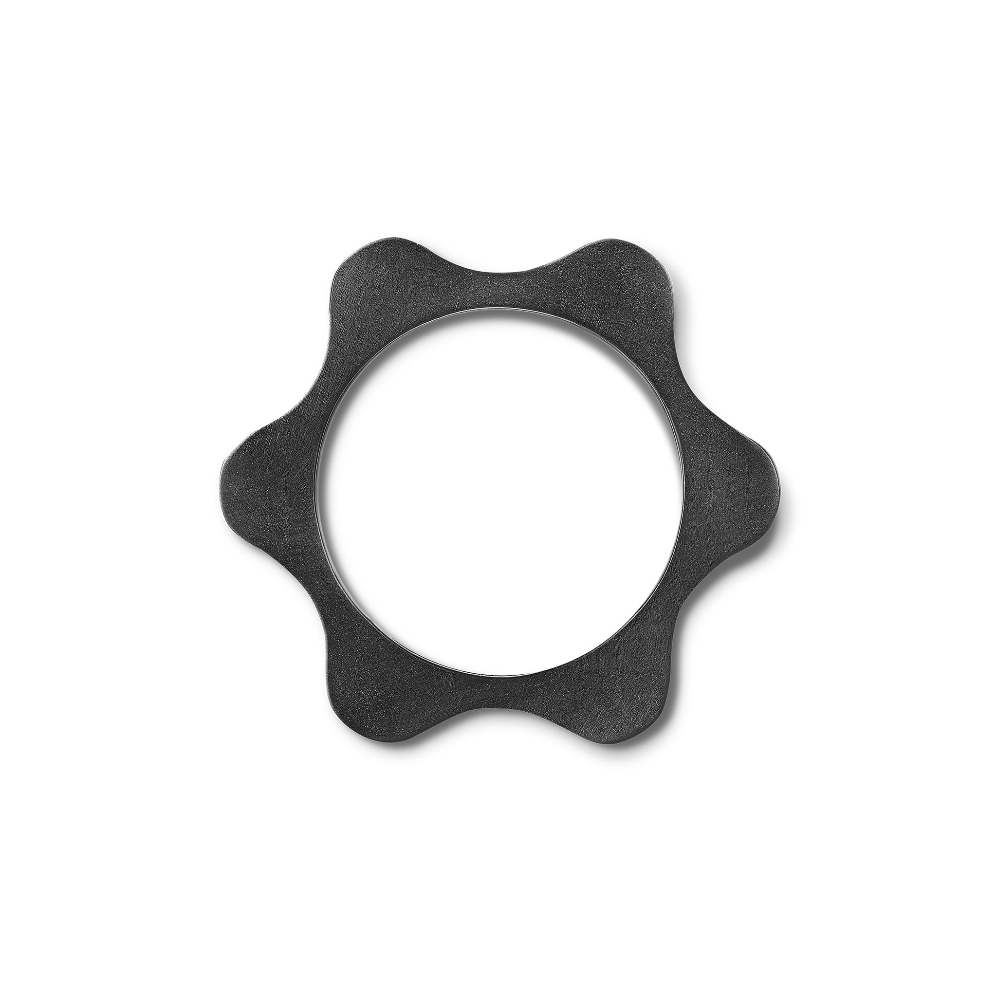 Кольцо с провокационным дизайном, напоминающим фрагмент советской мясорубки — прижимную гайку. Главная особенность украшения — внутренняя ребристая поверхность, которая оставляет лёгкий отпечаток на коже, напоминая о взаимодействии силы и хрупкости.